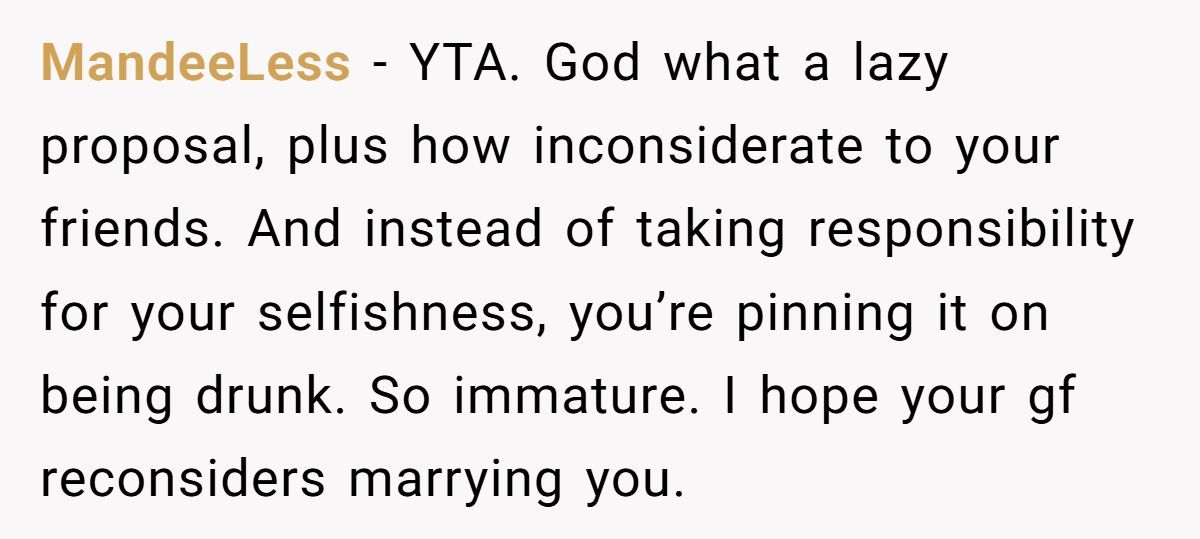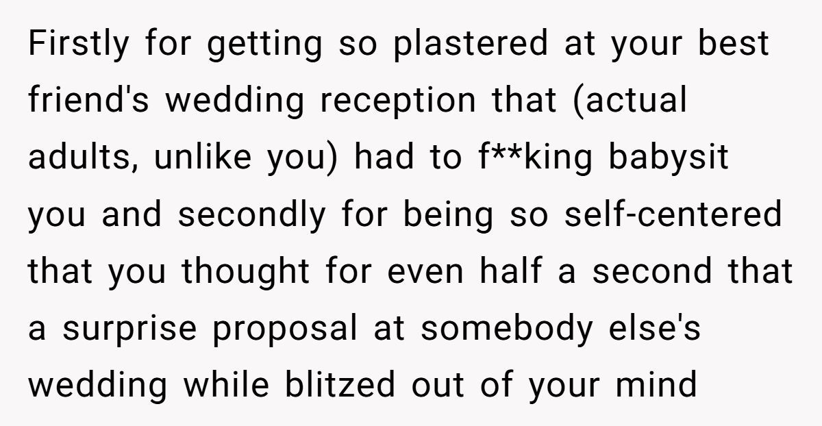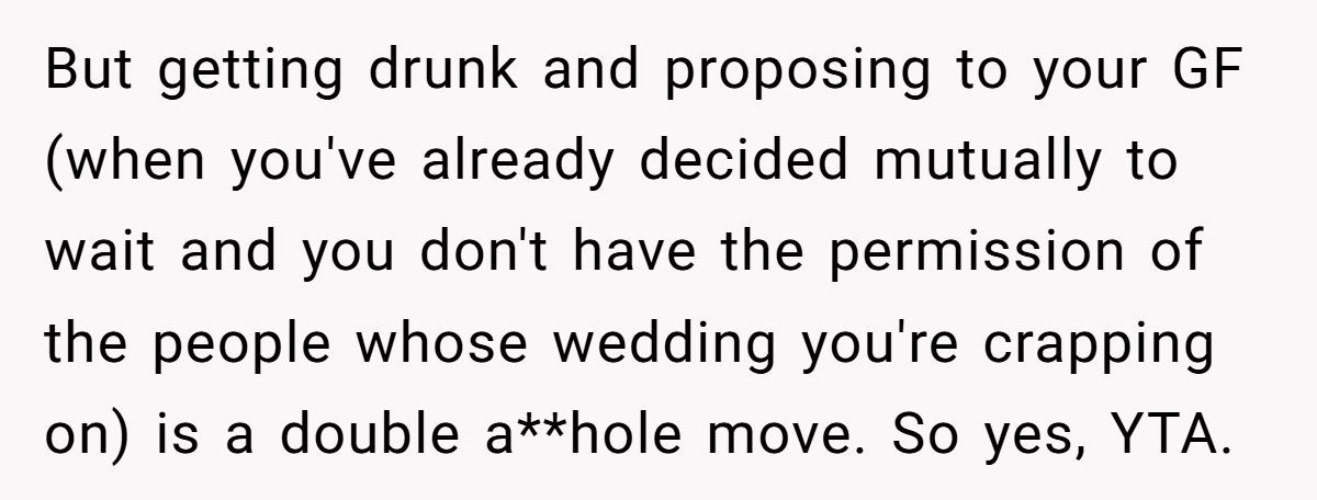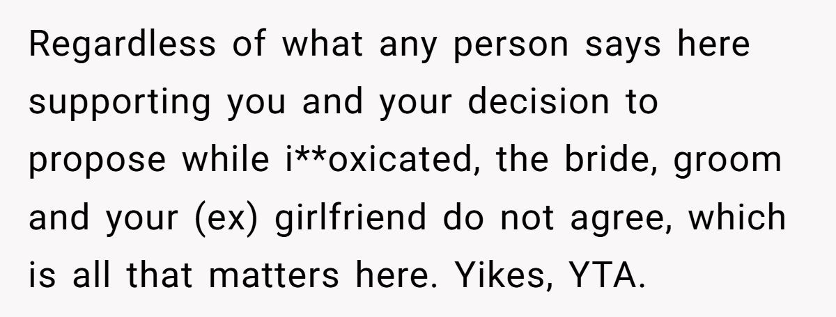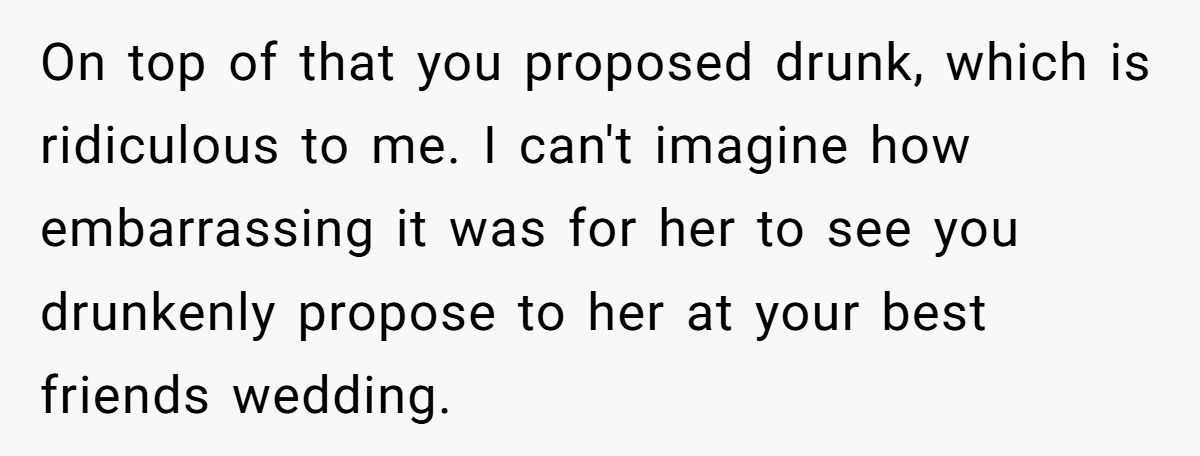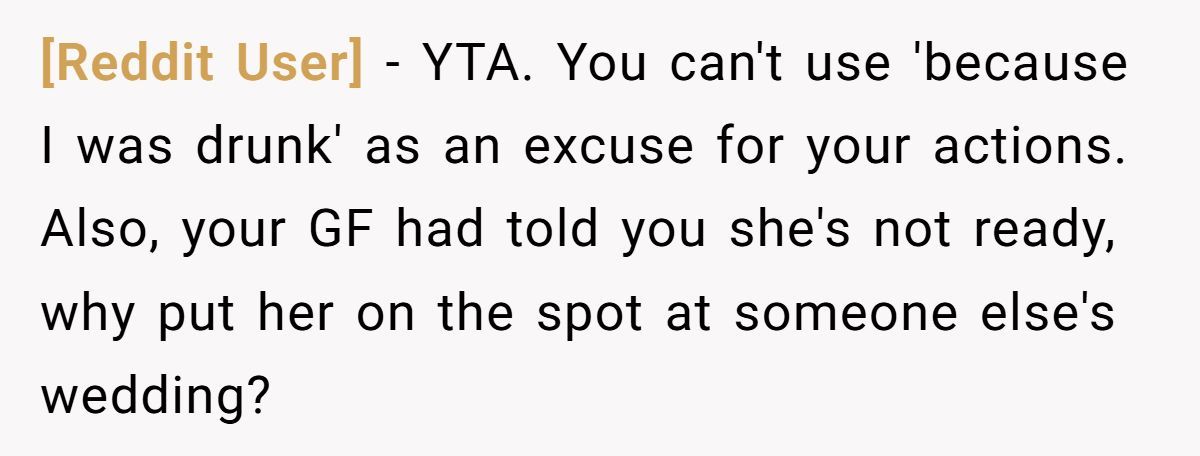 Commenters felt proposing while drunk at someone else’s wedding—especially after being told your girlfriend wasn’t ready—was selfish, immature, and completely inappropriate.