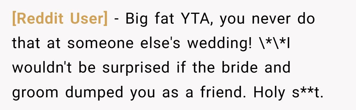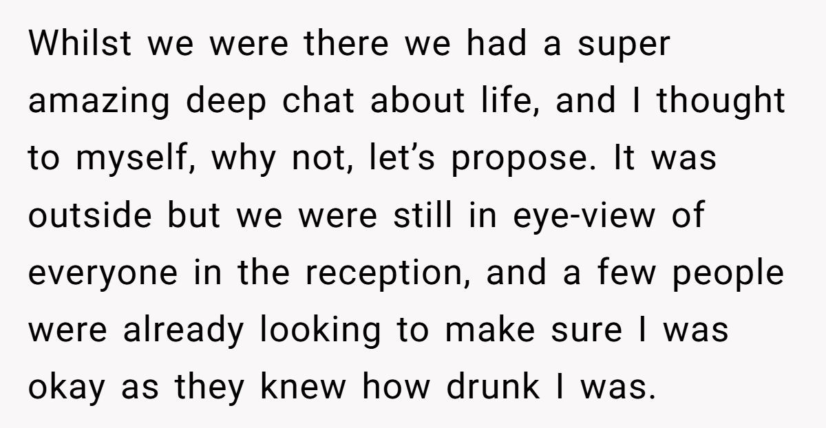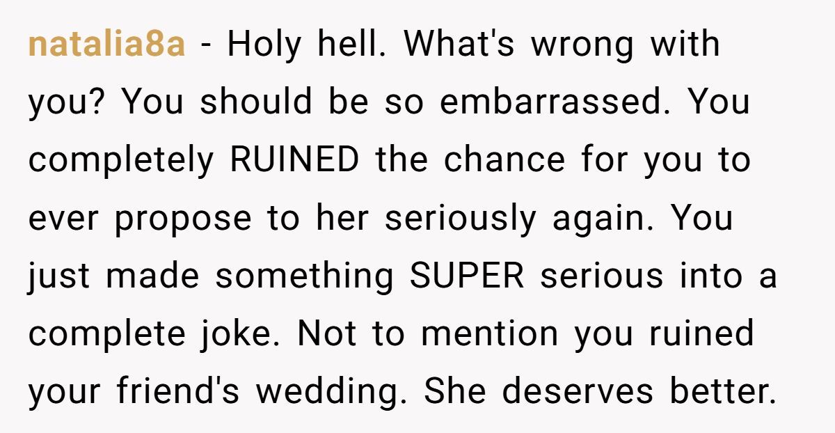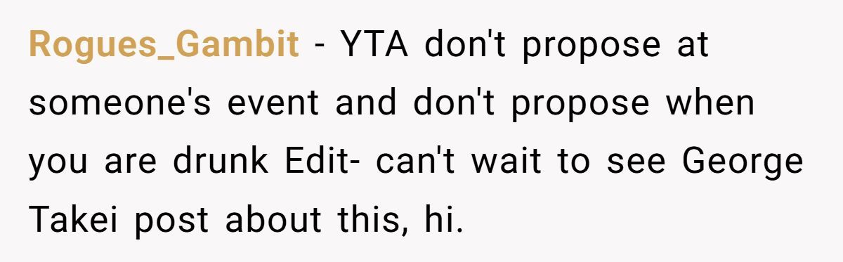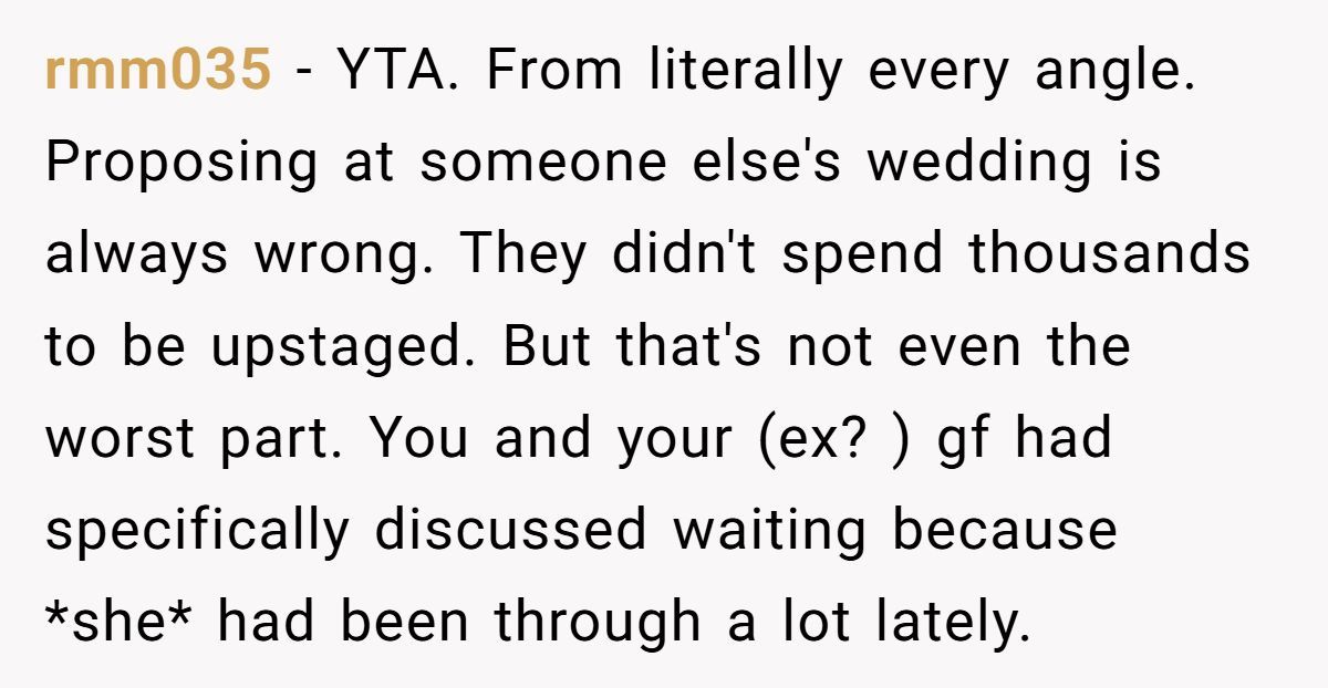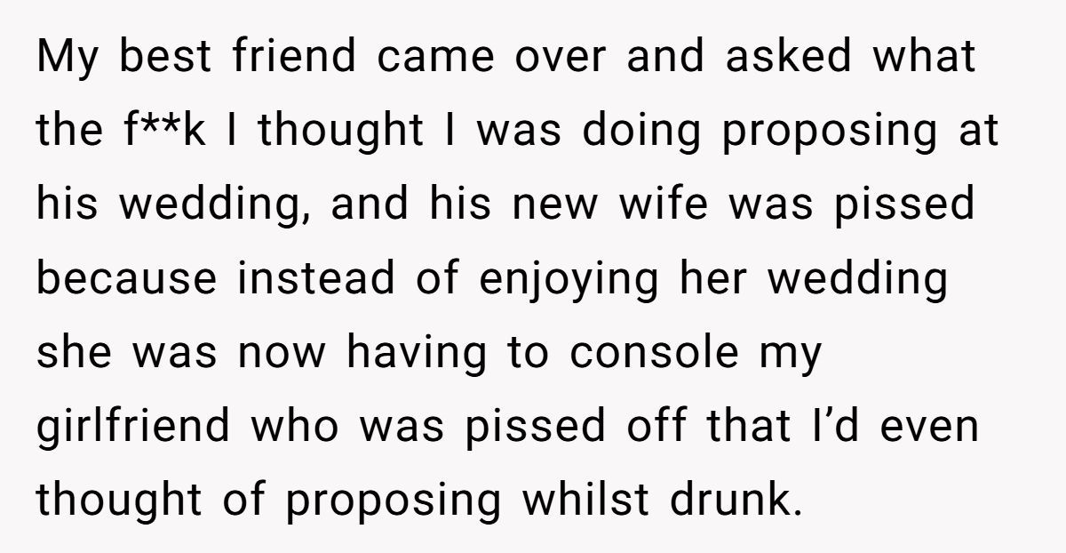 Commenters felt proposing while drunk at someone else’s wedding—especially after being told your girlfriend wasn’t ready—was selfish, immature, and completely inappropriate.