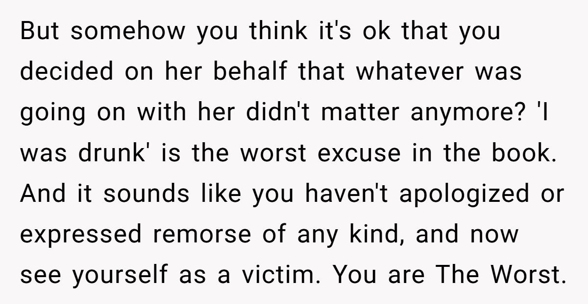His excuse—“I was drunk”—doesn’t hold water, as it sidesteps accountability for his actions and the hurt he caused.
