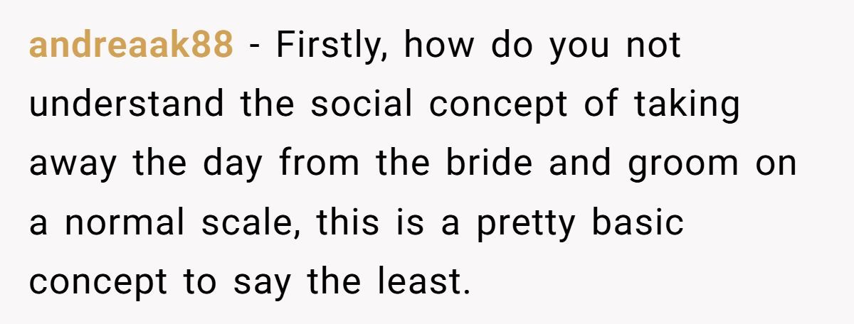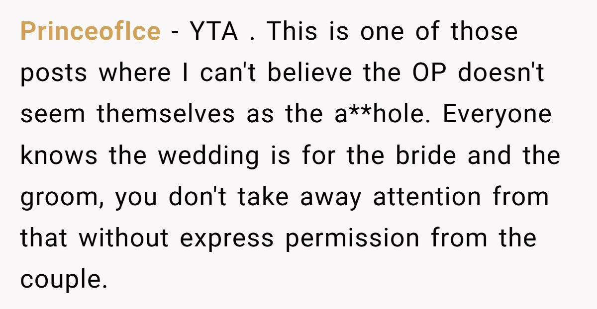 Some others agree. They called the proposal lazy, selfish, and disrespectful—both to the bride and groom whose day OP hijacked.
