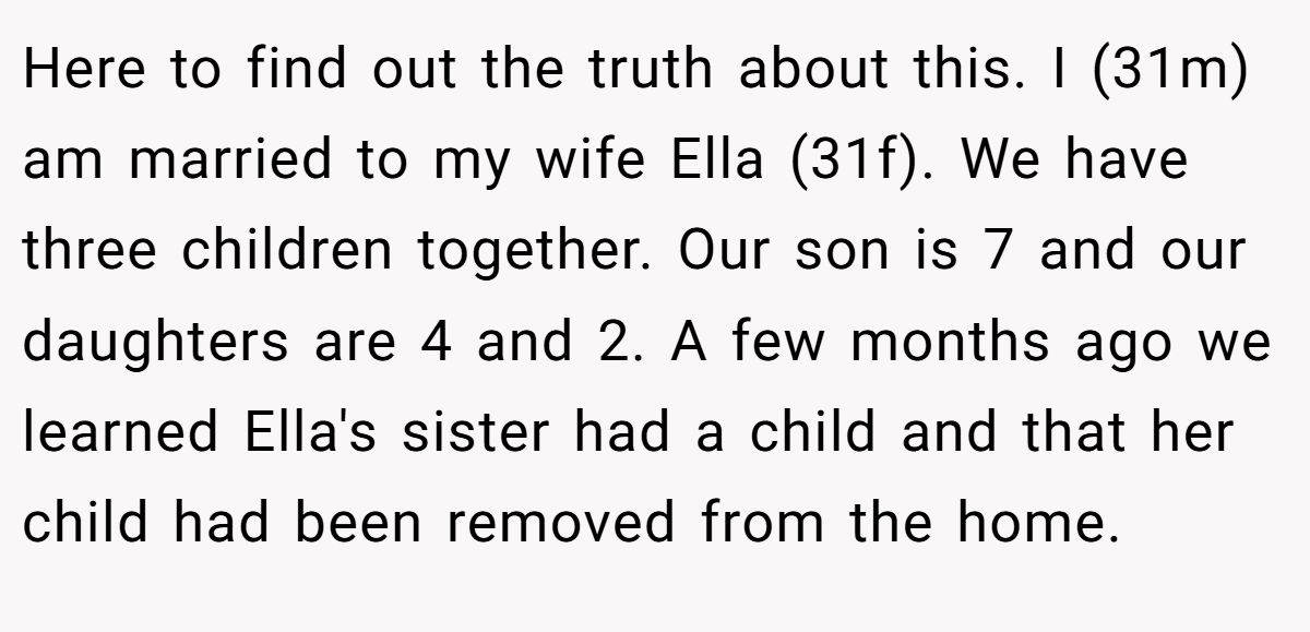 Here to find out the truth about this. I (31m) am married to my wife Ella (31f). We have three children together. Our son is 7 and our daughters are 4 and 2. A few months ago we learned Ella's sister had a child and that her child had been removed from the home.