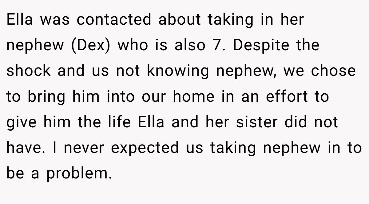 Ella was contacted about taking in her nephew (Dex) who is also 7. Despite the shock and us not knowing nephew, we chose to bring him into our home in an effort to give him the life Ella and her sister did not have. I never expected us taking nephew in to be a problem.