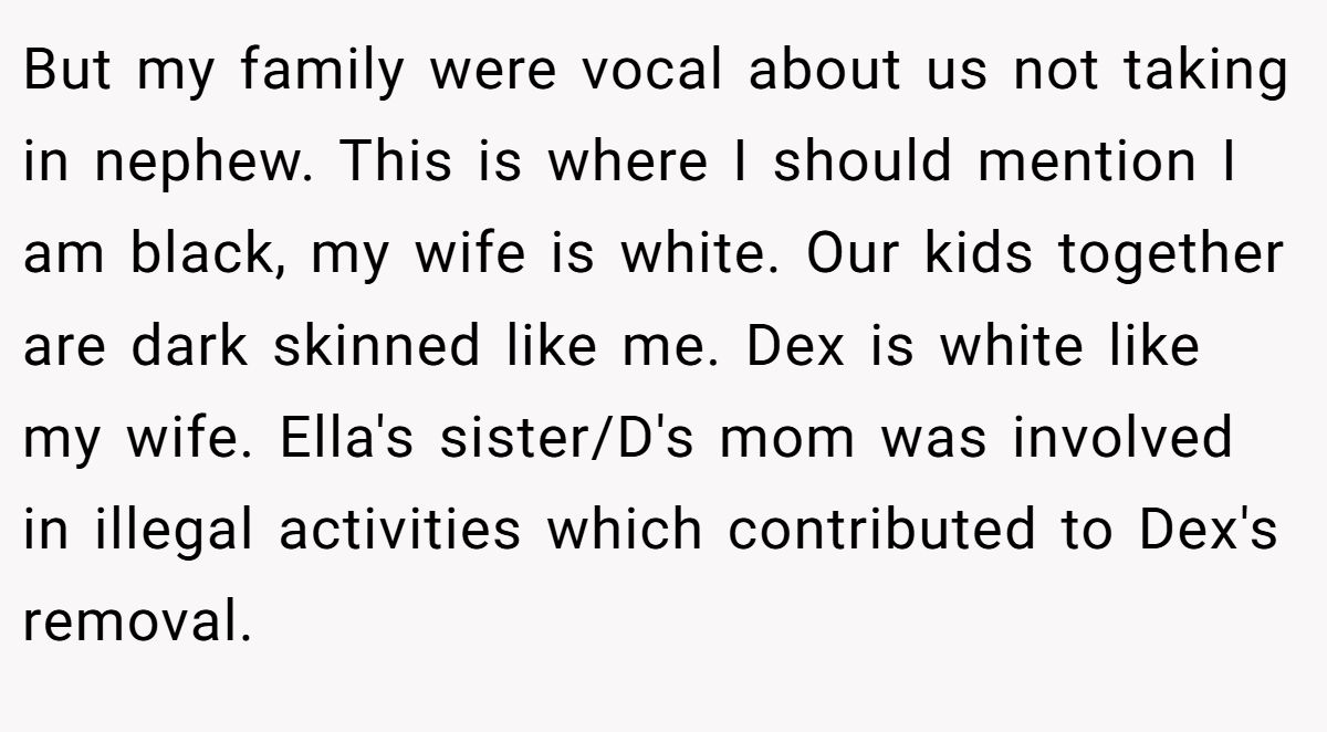 But my family were vocal about us not taking in nephew. This is where I should mention I am black, my wife is white. Our kids together are dark skinned like me. Dex is white like my wife. Ella's sister/D's mom was involved in illegal activities which contributed to Dex's removal.