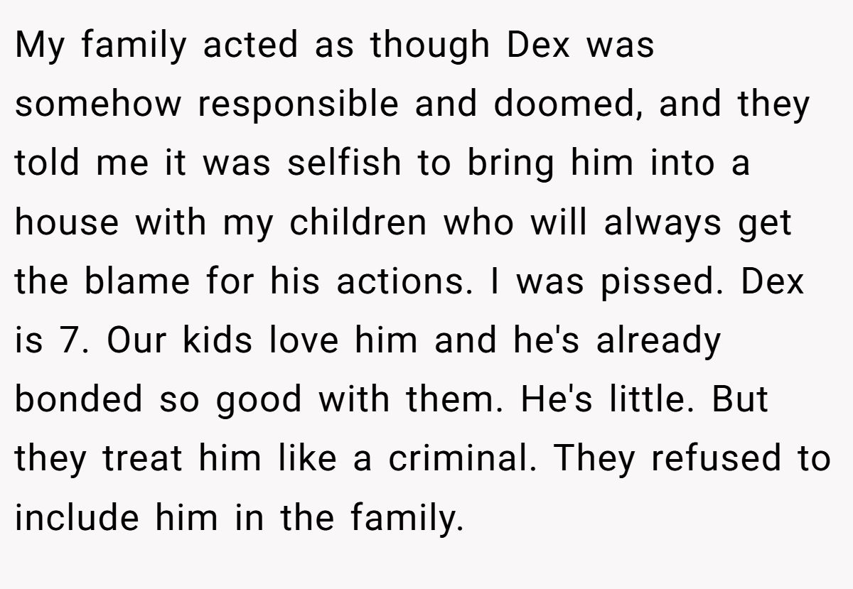 My family acted as though Dex was somehow responsible and doomed, and they told me it was selfish to bring him into a house with my children who will always get the blame for his actions. I was pissed. Dex is 7. Our kids love him and he's already bonded so good with them. He's little. But they treat him like a criminal. They refused to include him in the family.
