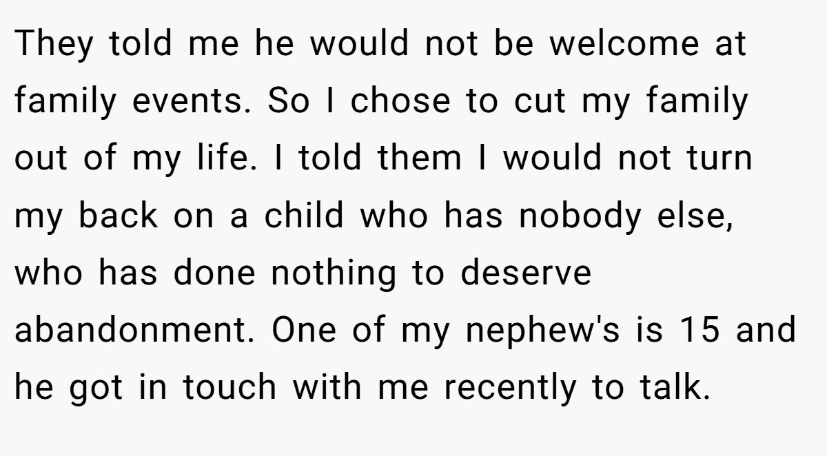 They told me he would not be welcome at family events. So I chose to cut my family out of my life. I told them I would not turn my back on a child who has nobody else, who has done nothing to deserve abandonment. One of my nephew's is 15 and he got in touch with me recently to talk.