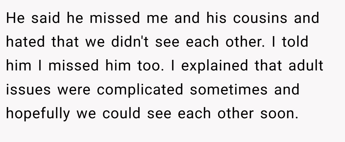He said he missed me and his cousins and hated that we didn't see each other. I told him I missed him too. I explained that adult issues were complicated sometimes and hopefully we could see each other soon.