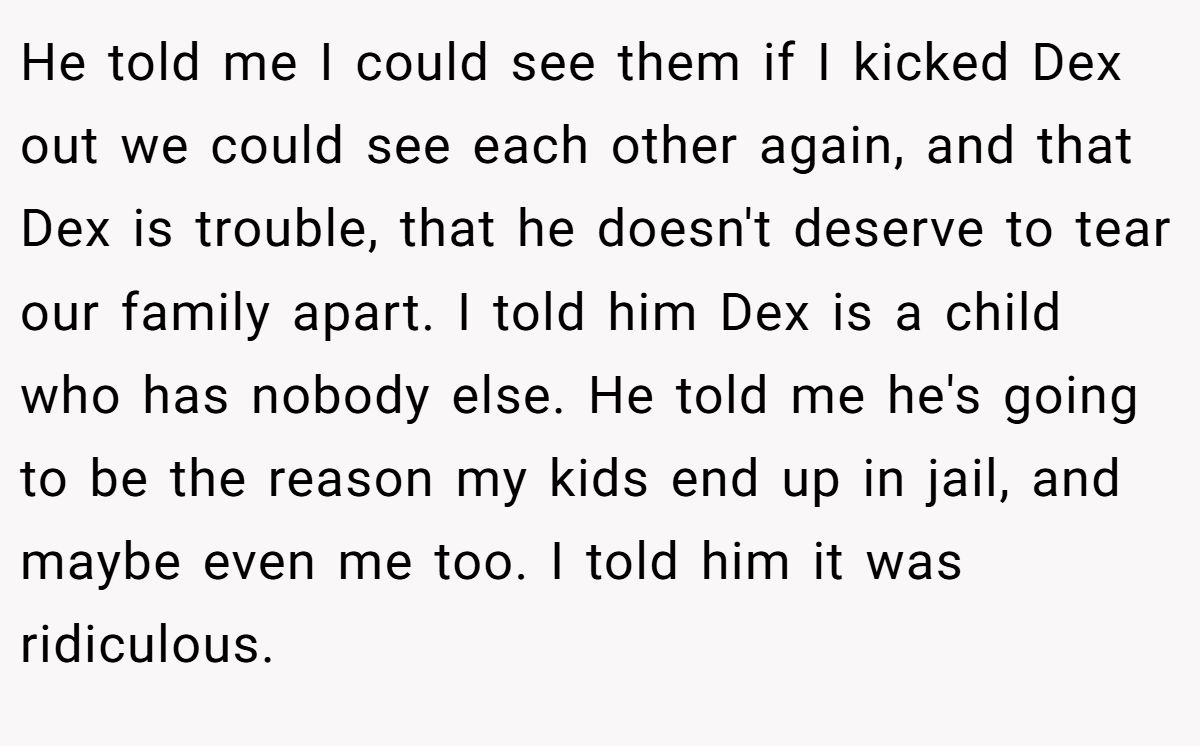 He told me I could see them if I kicked Dex out we could see each other again, and that Dex is trouble, that he doesn't deserve to tear our family apart. I told him Dex is a child who has nobody else. He told me he's going to be the reason my kids end up in jail, and maybe even me too. I told him it was ridiculous.