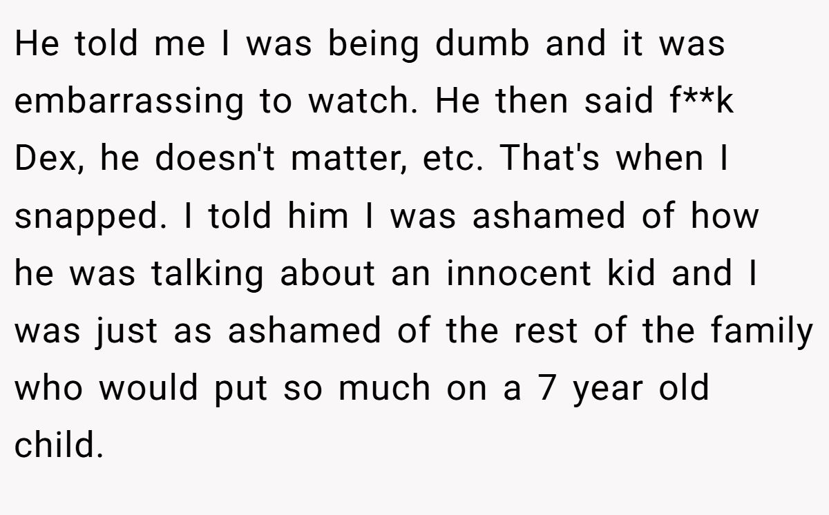 He told me I was being dumb and it was embarrassing to watch. He then said f**k Dex, he doesn't matter, etc. That's when I snapped. I told him I was ashamed of how he was talking about an innocent kid and I was just as ashamed of the rest of the family who would put so much on a 7 year old child.