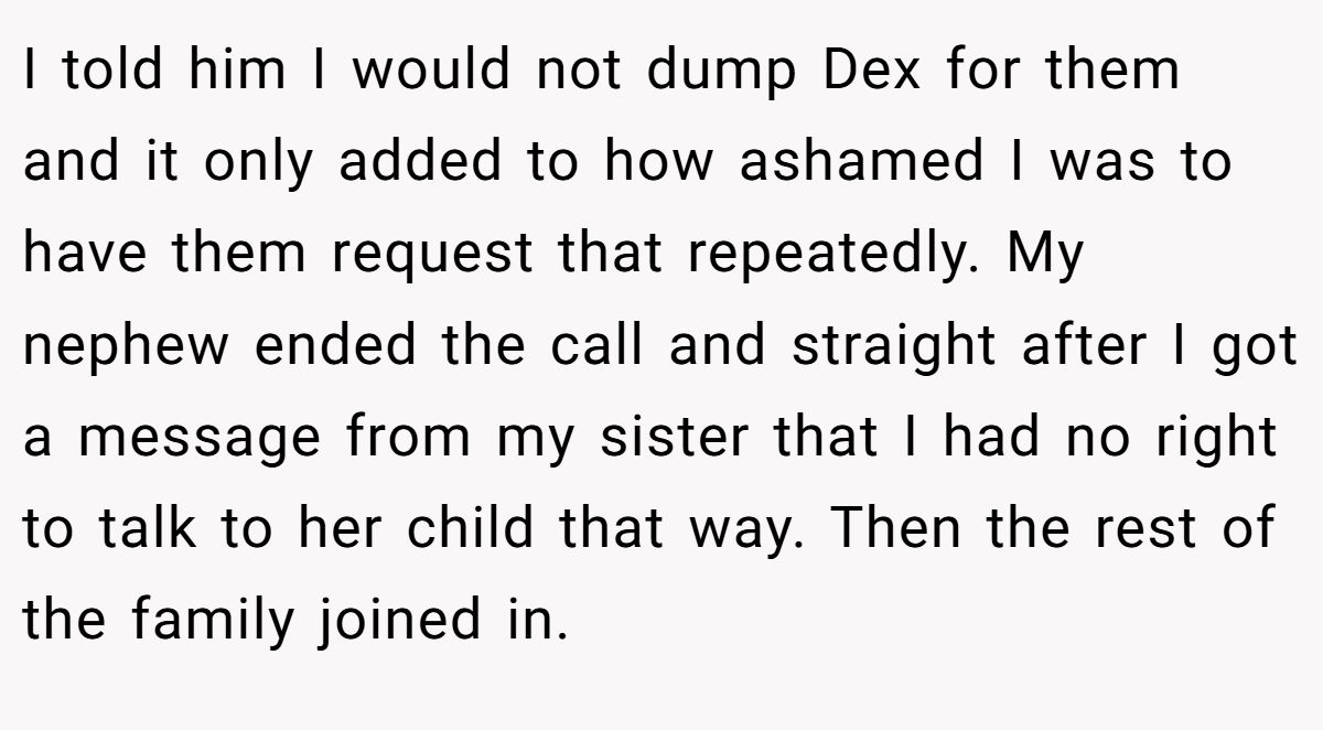 I told him I would not dump Dex for them and it only added to how ashamed I was to have them request that repeatedly. My nephew ended the call and straight after I got a message from my sister that I had no right to talk to her child that way. Then the rest of the family joined in.
