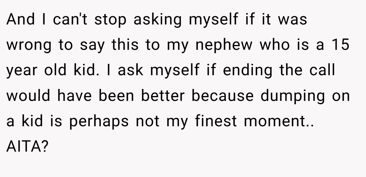 And I can't stop asking myself if it was wrong to say this to my nephew who is a 15 year old kid. I ask myself if ending the call would have been better because dumping on a kid is perhaps not my finest moment.. AITA?