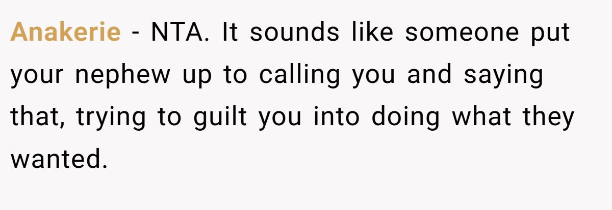 Anakerie − NTA. It sounds like someone put your nephew up to calling you and saying that, trying to guilt you into doing what they wanted.
