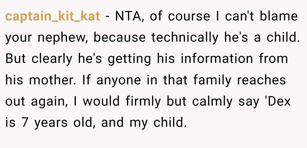 captain_kit_kat − NTA, of course I can't blame your nephew, because technically he's a child. But clearly he's getting his information from his mother. If anyone in that family reaches out again, I would firmly but calmly say 'Dex is 7 years old, and my child.