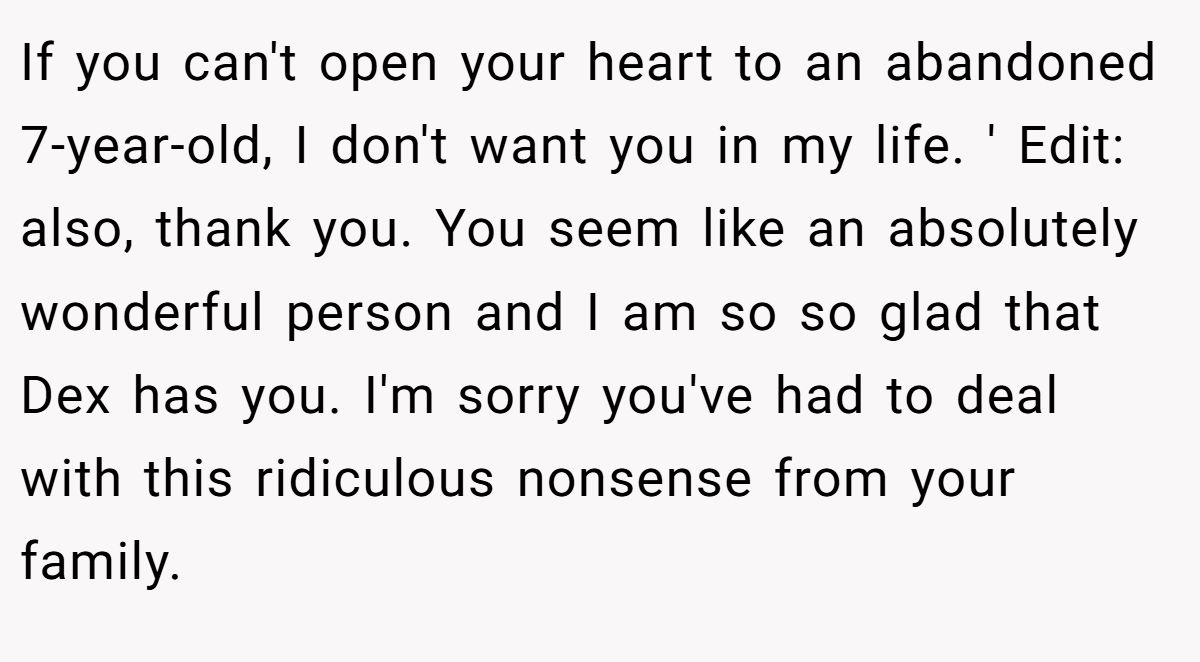 If you can't open your heart to an abandoned 7-year-old, I don't want you in my life. ' Edit: also, thank you. You seem like an absolutely wonderful person and I am so so glad that Dex has you. I'm sorry you've had to deal with this ridiculous nonsense from your family.