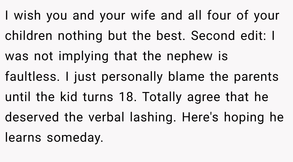 I wish you and your wife and all four of your children nothing but the best. Second edit: I was not implying that the nephew is faultless. I just personally blame the parents until the kid turns 18. Totally agree that he deserved the verbal lashing. Here's hoping he learns someday.