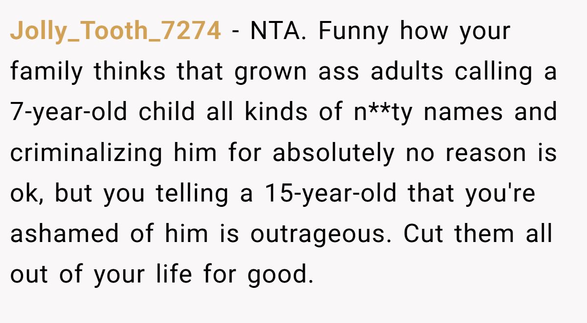 Jolly_Tooth_7274 − NTA. Funny how your family thinks that grown ass adults calling a 7-year-old child all kinds of n**ty names and criminalizing him for absolutely no reason is ok, but you telling a 15-year-old that you're ashamed of him is outrageous. Cut them all out of your life for good.