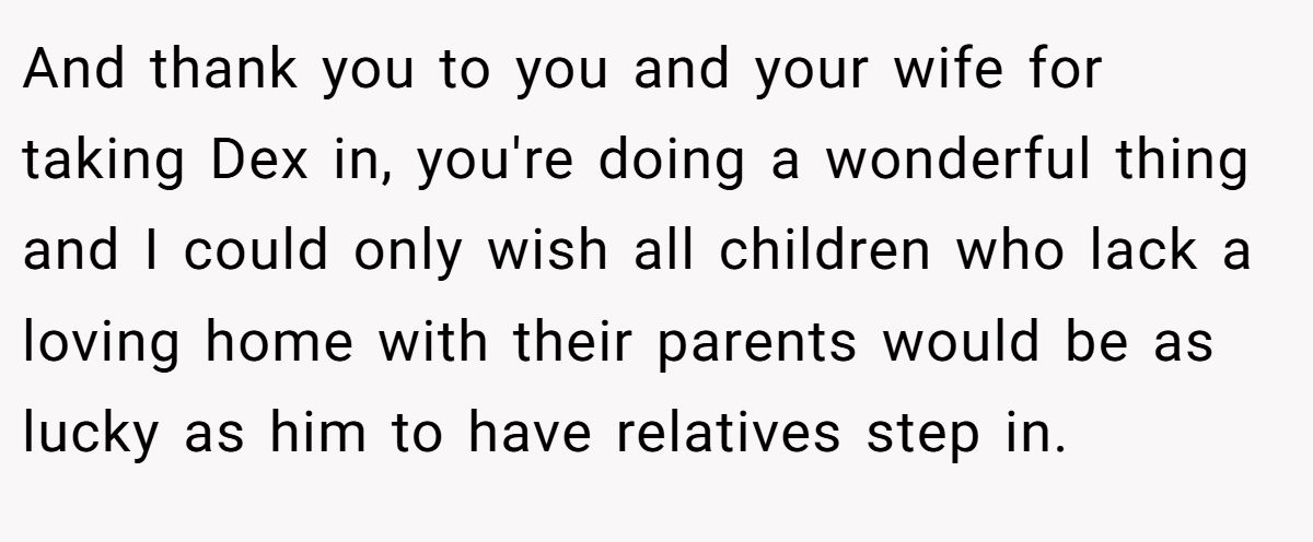 The Redditor’s choice to take in Dex is heroic, foster care data shows only 20% of kids find stable homes with relatives, per a 2023 Child Welfare study. His family’s bias, though, reeks of prejudice, as Fun_Organization3857 hinted, possibly tied to racial differences or unfounded fears about Dex’s future.