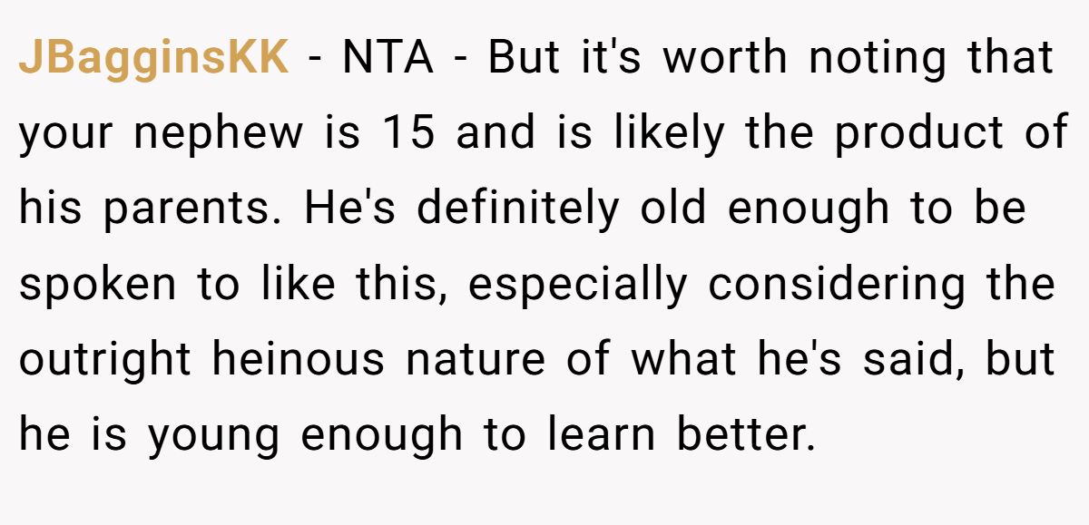 JBagginsKK supports the original poster (OP) as Not The Asshole (NTA), noting that the 15-year-old nephew, influenced by his parents, is accountable for his actions but still young enough to learn from the verbal reprimand he received.