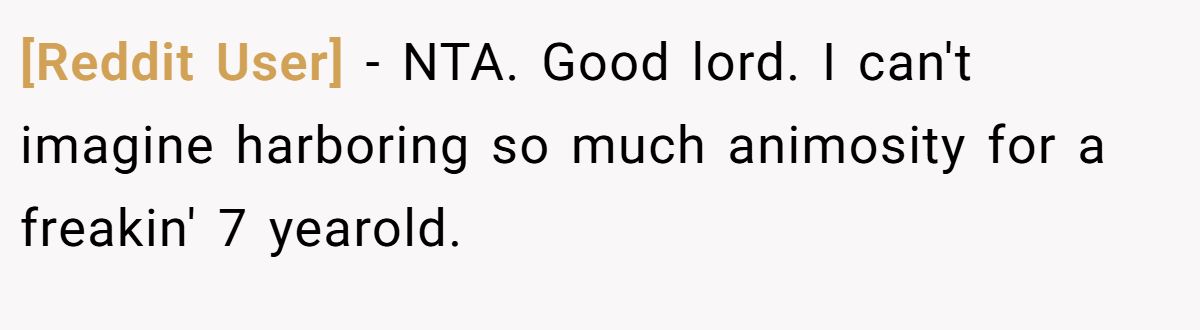 [Reddit User] − NTA. Good lord. I can't imagine harboring so much animosity for a freakin' 7 yearold.