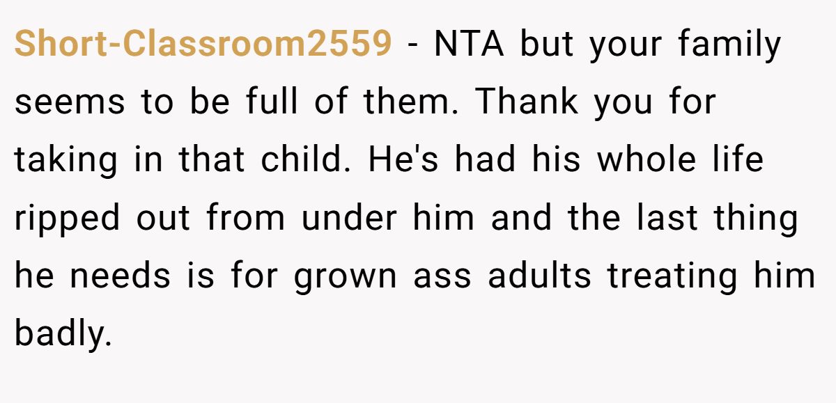 Short-Classroom2559 − NTA but your family seems to be full of them. Thank you for taking in that child. He's had his whole life ripped out from under him and the last thing he needs is for grown ass adults treating him badly.