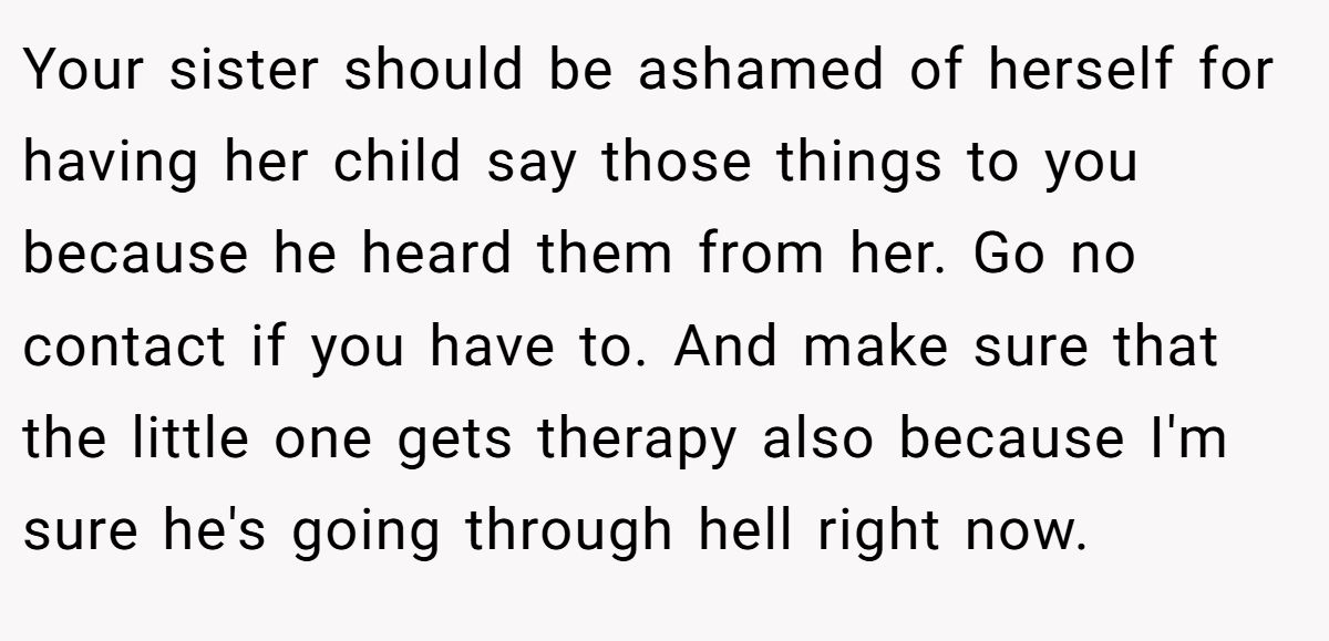 Your sister should be ashamed of herself for having her child say those things to you because he heard them from her. Go no contact if you have to. And make sure that the little one gets therapy also because I'm sure he's going through hell right now.