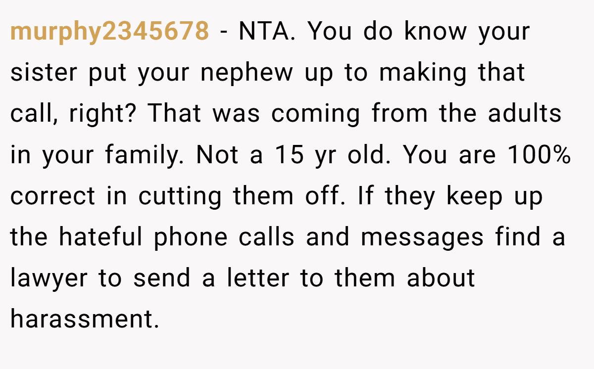 Murphy2345678 supports the original poster (OP) as Not The Asshole (NTA), asserting that the sister likely orchestrated the nephew’s call and recommending OP cut ties, seek legal action against harassment, and retain evidence of family communications.