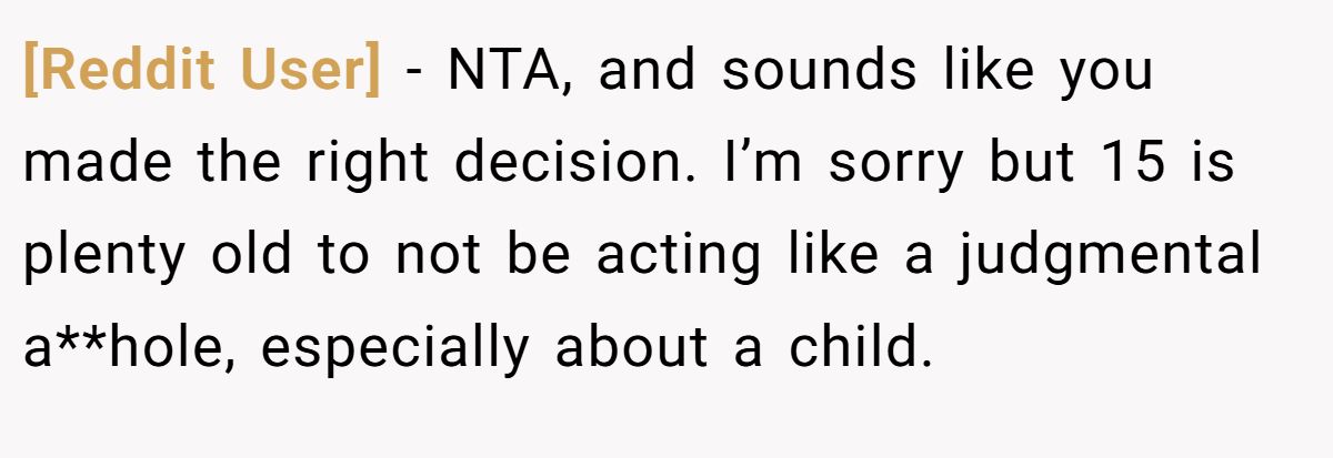 [Reddit User] − NTA, and sounds like you made the right decision. I’m sorry but 15 is plenty old to not be acting like a judgmental a**hole, especially about a child.