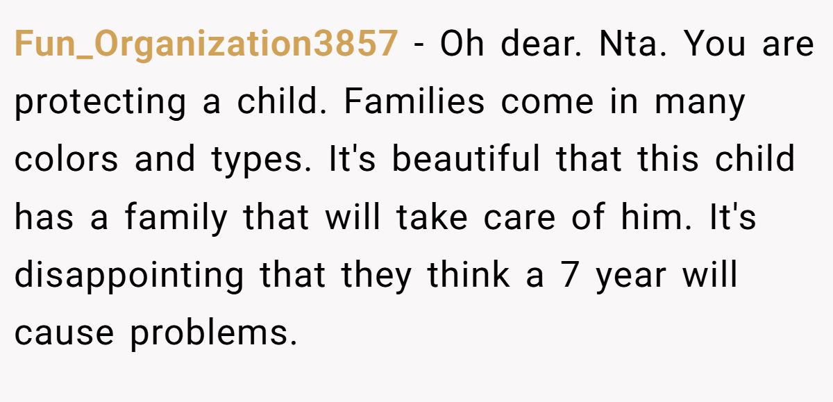 Fun_Organization3857 − Oh dear. Nta. You are protecting a child. Families come in many colors and types. It's beautiful that this child has a family that will take care of him. It's disappointing that they think a 7 year will cause problems.