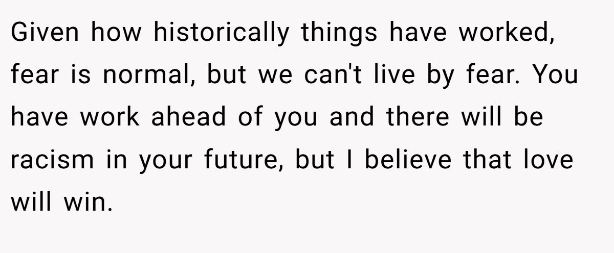Given how historically things have worked, fear is normal, but we can't live by fear. You have work ahead of you and there will be racism in your future, but I believe that love will win.