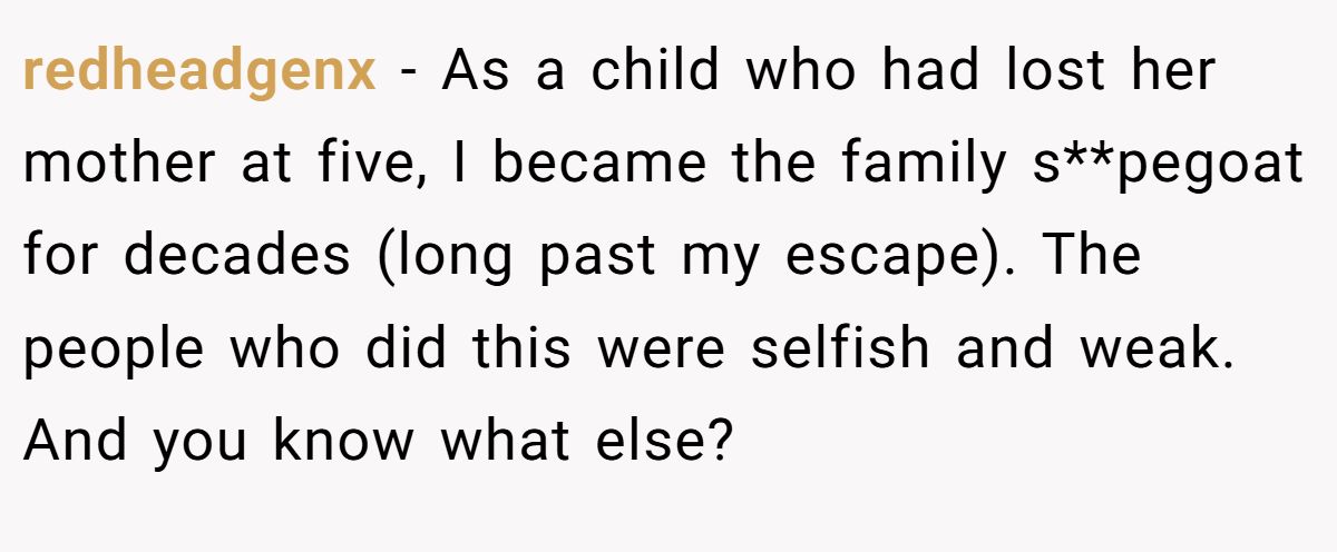 redheadgenx − As a child who had lost her mother at five, I became the family s**pegoat for decades (long past my escape). The people who did this were selfish and weak. And you know what else?
