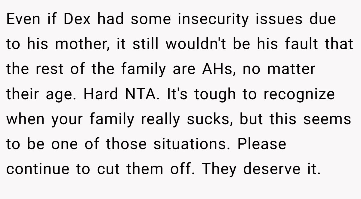 Even if Dex had some insecurity issues due to his mother, it still wouldn't be his fault that the rest of the family are AHs, no matter their age. Hard NTA. It's tough to recognize when your family really sucks, but this seems to be one of those situations. Please continue to cut them off. They deserve it.