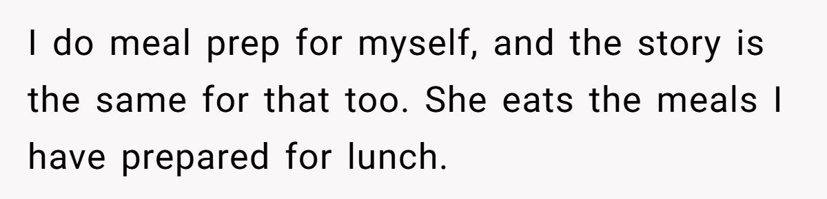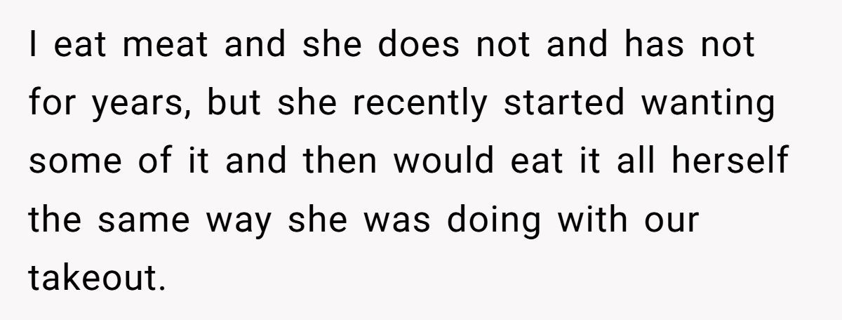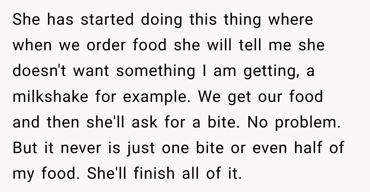 This Redditor isn’t new to compromise. He’s ordered doubles, meal-prepped like a champ, and even offered to make extras just in case her cravings changed. Still, the “just one bite” routine always ends with him staring at an empty plate—and grabbing a granola bar while she naps.