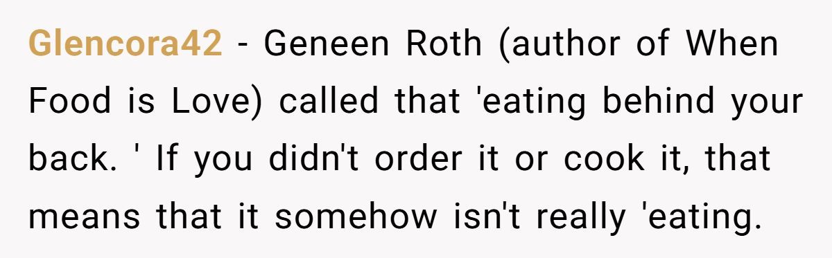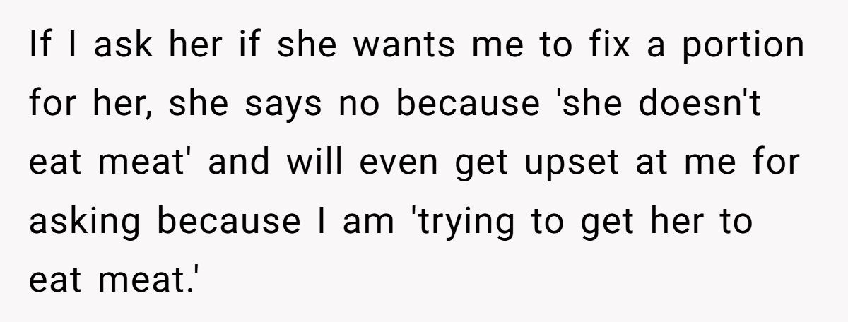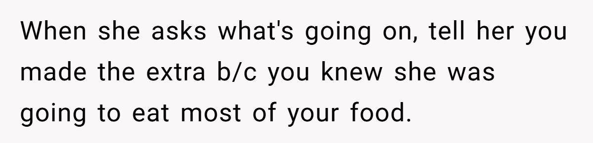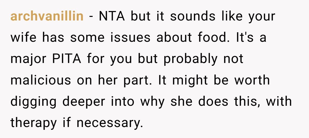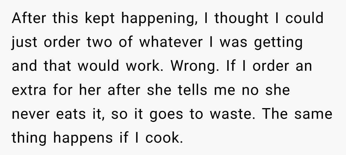 Some Redditors suggest cooking double portions or keeping a mini snack stash. Others recommend doing grocery runs together so she can say what looks good in the moment. And if it’s deeper—like food guilt or stress—talking to a therapist might help ease the tension.