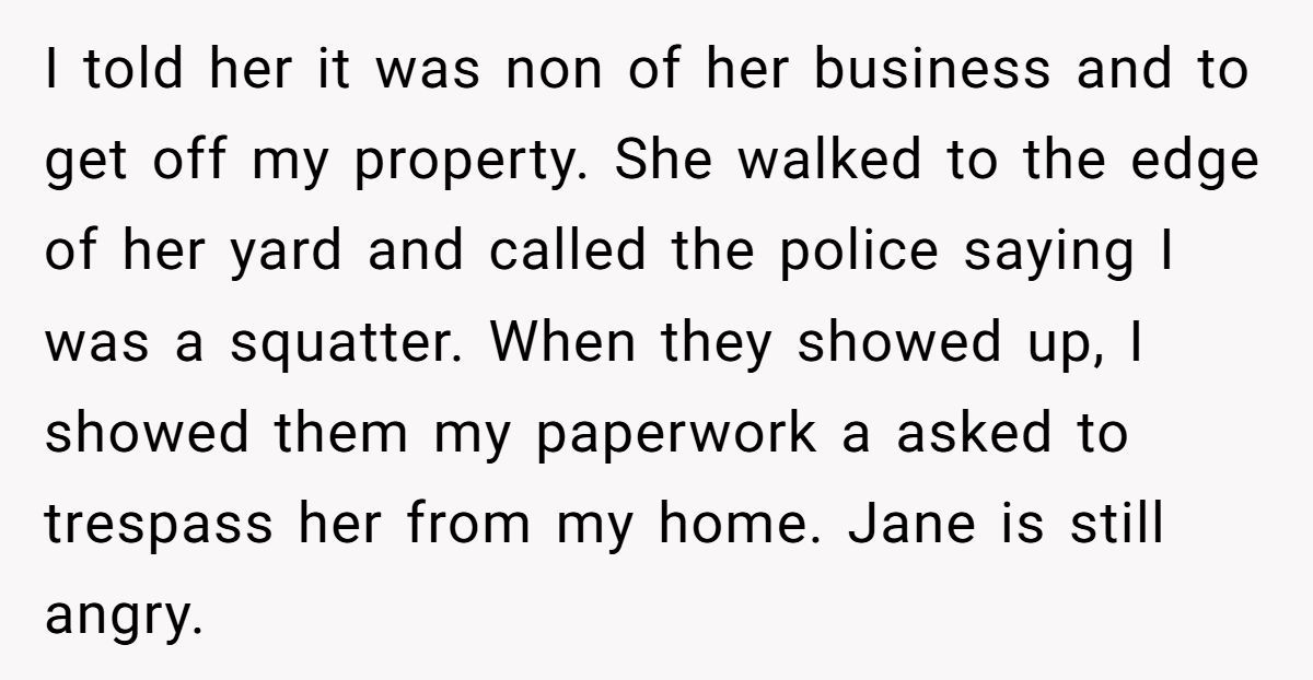 The Redditor’s response? A firm “mind your business” and a trespass order when Jane called the cops. Bold move, but was it the right one?
