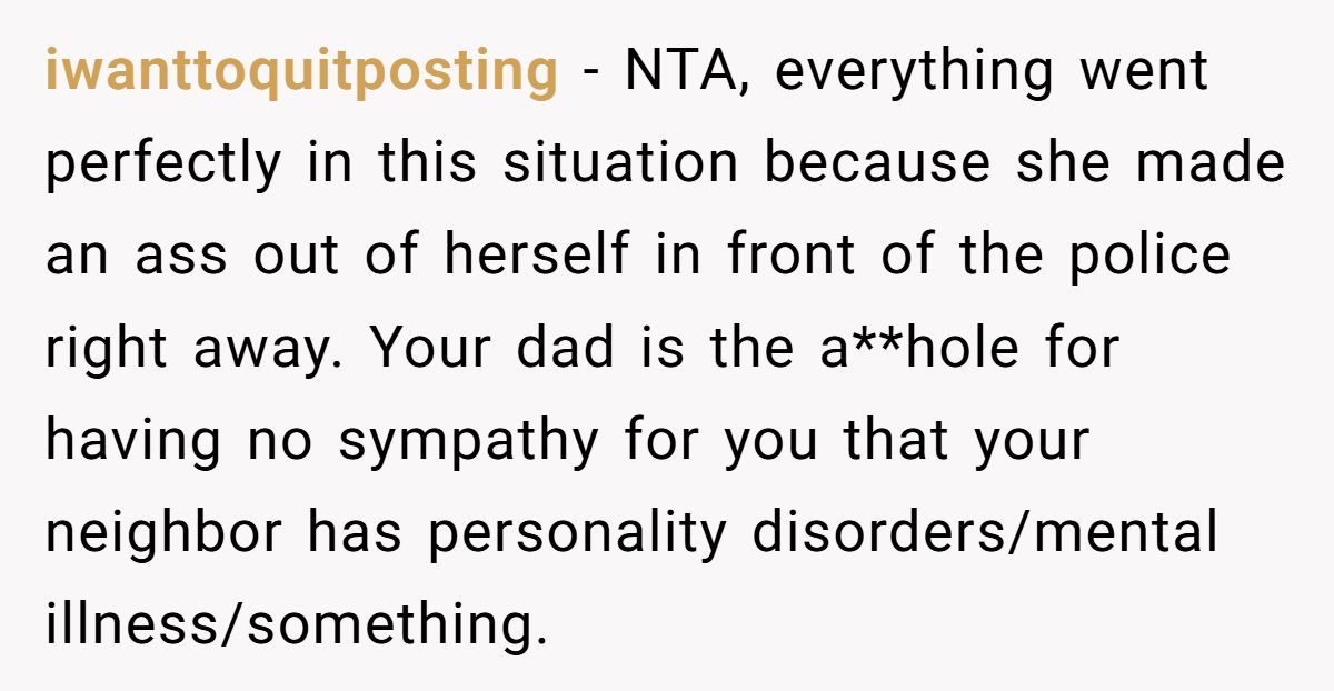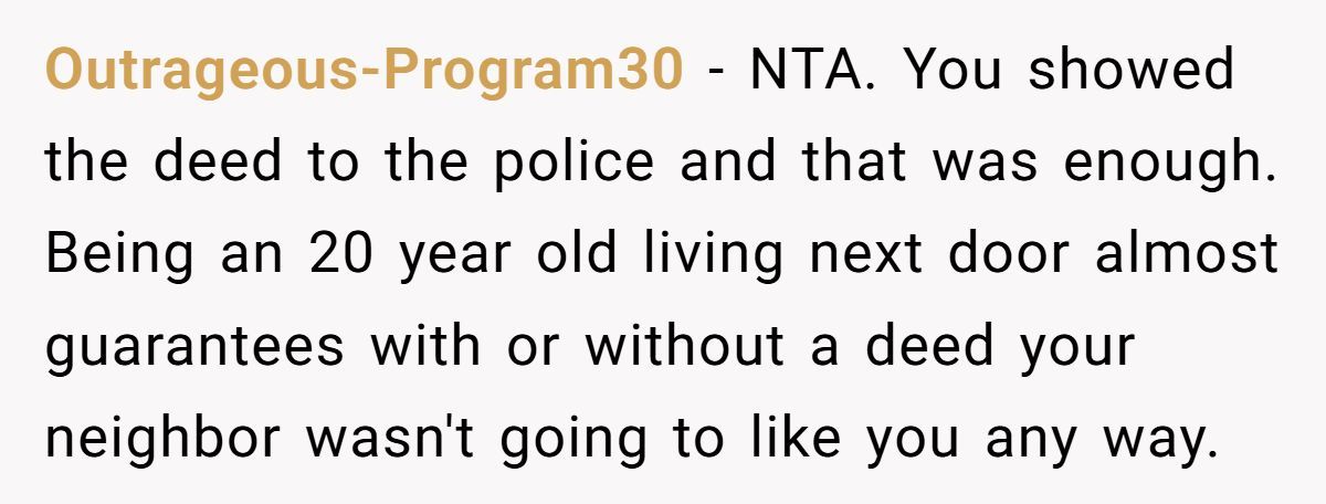 Commenters agreed OP was NTA, saying the neighbor was unhinged and the dad was unsupportive. Most felt showing the deed to the police was the right move.