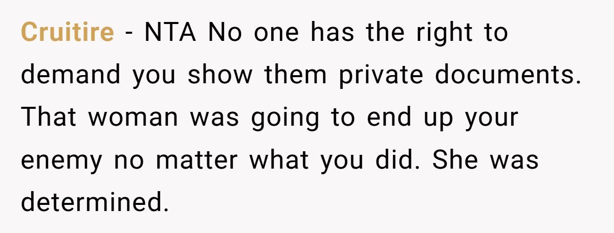 Jane’s behavior, however, screams entitlement—assuming she had the right to demand private documents. This taps into a broader issue: neighbor disputes often stem from miscommunication or unchecked assumptions, with 15% of Americans reporting conflicts with neighbors, per a 2022 Pew Research study.
