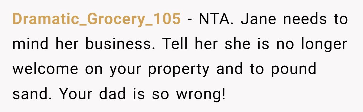 Armed with paperwork and a no-nonsense attitude, our heroine stood her ground, but not without her dad suggesting she might’ve been too harsh. Was she wrong to shut Jane down, or is this just a case of a neighbor needing to mind her own lawn?