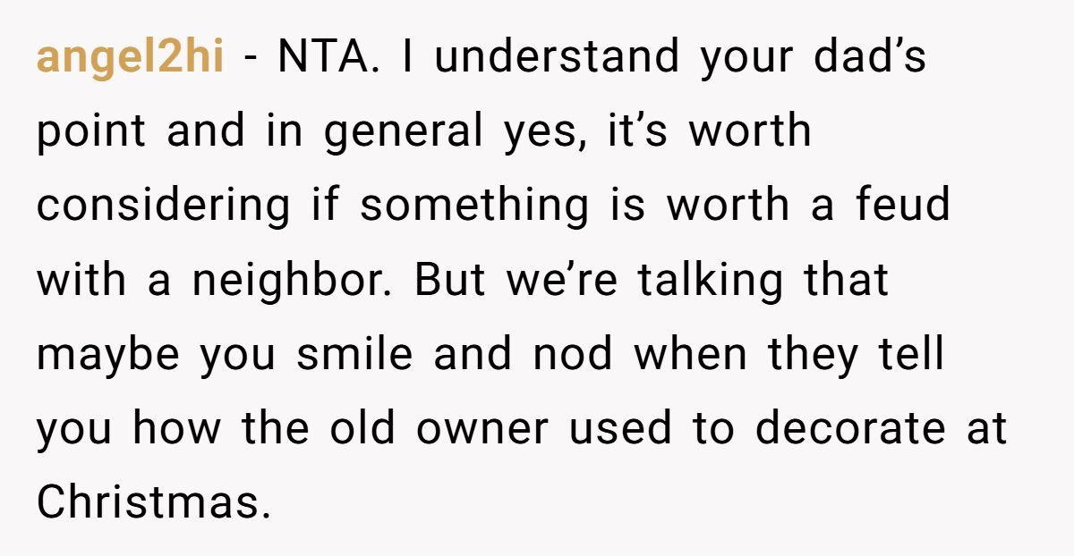 Yet, her dad’s advice to de-escalate raises a fair point: neighbors are long-term fixtures, and feuds can sour daily life.