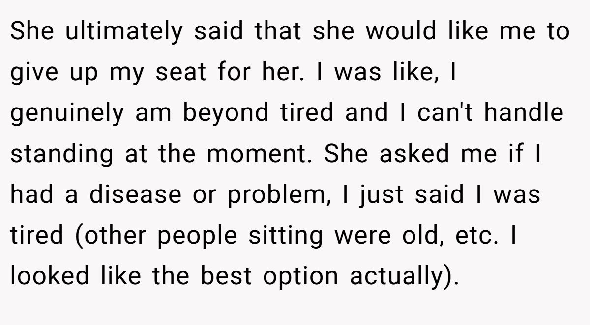 A fleeting moment of honesty, like “I’m a doctor, I might collapse if I stand, can someone else help?” could’ve softened the clash, acknowledging both struggles. Transit systems could prevent these heart-wrenching standoffs with clearer signage or staff intervention, as Reddit user iolaus79 noted: the seat wasn’t even marked as priority, shifting the moral weight.