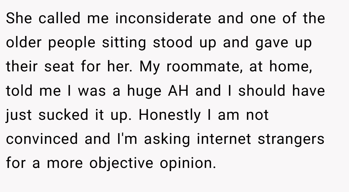 The air crackles with tension: she insists you move, but standing risks collapse. What follows is a heated clash, a roommate’s harsh judgment, and Reddit’s explosive debate. Want the full story? Dive into the Reddit post below!