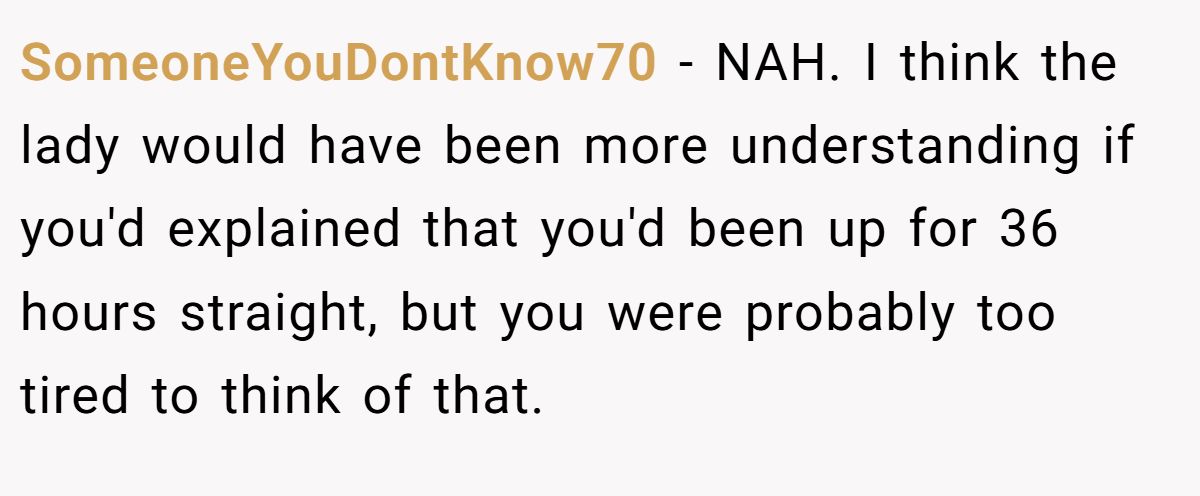 SomeoneYouDontKnow70 takes a neutral stance, suggesting that an explanation of the 36-hour sleepless stretch might have garnered more understanding from the lady involved, though acknowledging the exhaustion likely clouded that judgment.