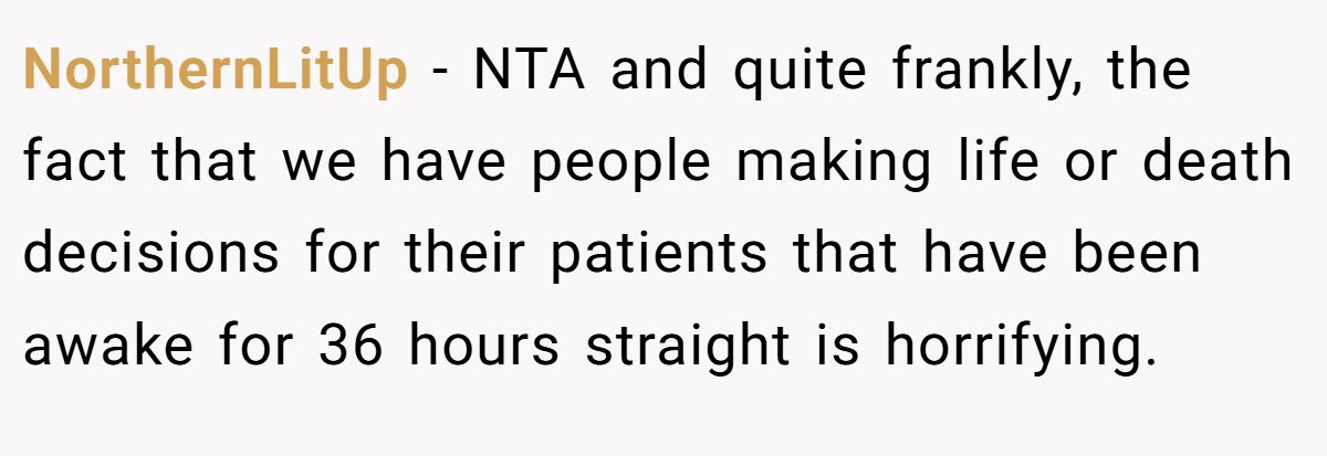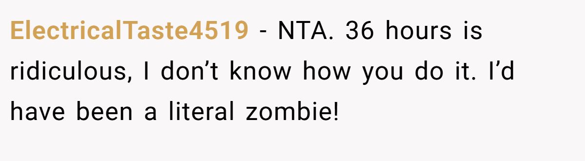 ElectricalTaste4519 echoes the NTA stance, marveling at the endurance required for a 36-hour shift and sympathizing with the zombie-like state it induces.