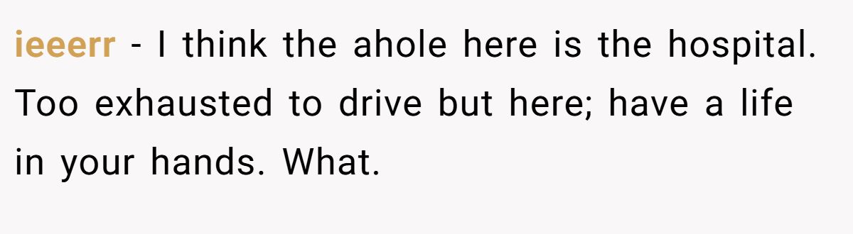 Ieeerr shifts the blame to the hospital, expressing disbelief and frustration that someone too exhausted to drive is still entrusted with life-or-death responsibilities.