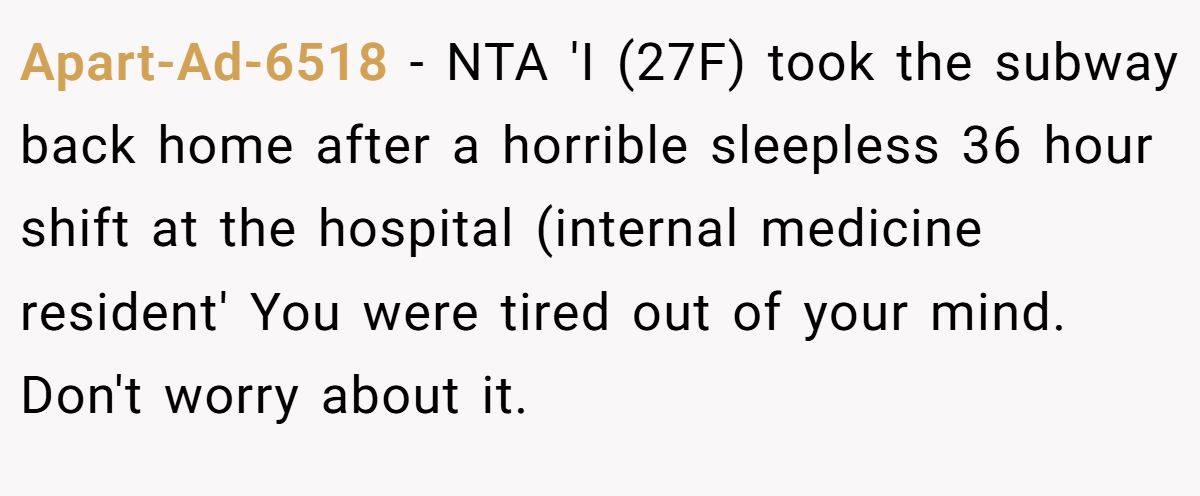 Apart-Ad-6518 supports the NTA verdict, acknowledging the exhaustion from a grueling 36-hour hospital shift as a valid reason for the 27F resident to prioritize rest.