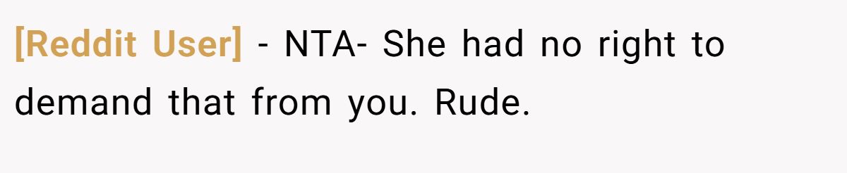 This Reddit User firmly declares NTA, condemning the woman’s demand as rude and unwarranted.