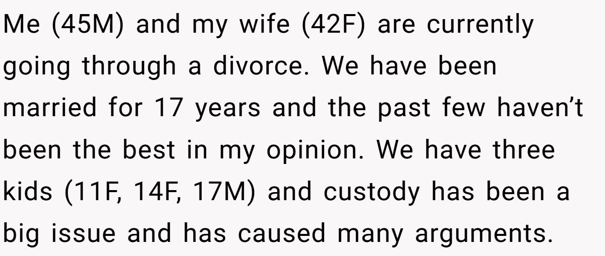 This Redditor, let’s call him Honest Dad, is navigating a messy divorce from his wife of 17 years. Custody battles over their three kids, ages 11, 14, and 17, are at the heart of their conflict. Their oldest, a college-bound senior, shocked his mom by requesting sole custody with Honest Dad, revealing a rift that had been growing for years.
