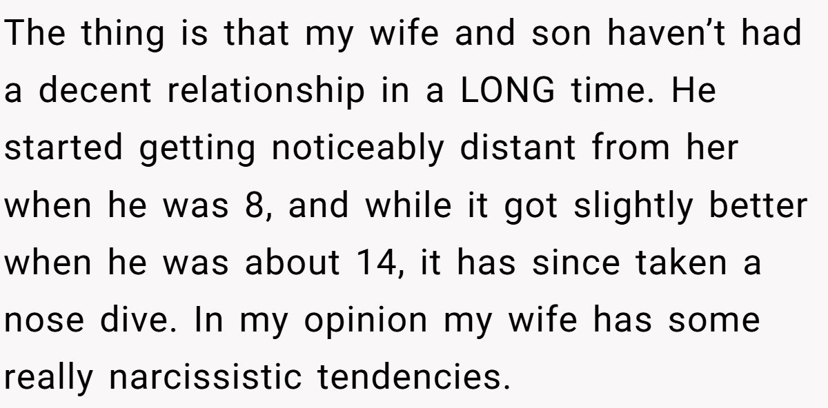 Talk about a family showdown worthy of a courtroom drama. Honest Dad’s clash with his wife is a raw look at how divorce can amplify every tension. The son’s decision to keep his mother out of the loop was not an accident. It reflected years of feeling unheard or criticized. According to Honest Dad, this distance began when the boy was eight and worsened as he became a teenager. His mental health struggles, which his mom often made about her own worries and image, likely made him feel even more alone.