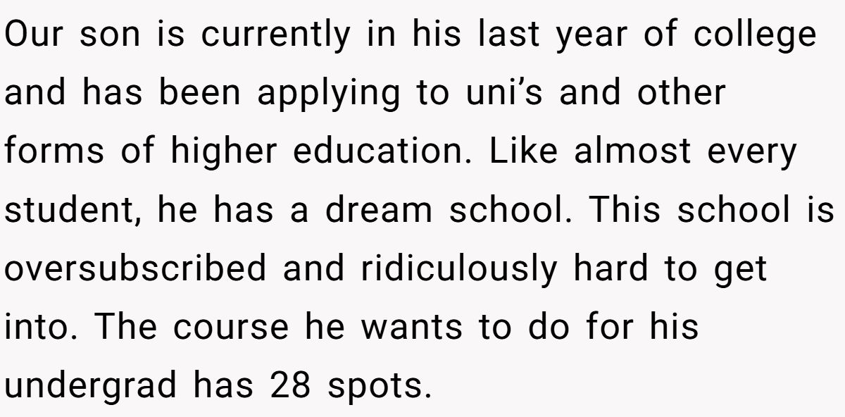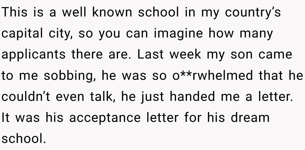This Redditor, let’s call him Honest Dad, is navigating a messy divorce from his wife of 17 years, with custody battles over their three kids (11F, 14F, 17M) at the heart of it. Their 17-year-old son, a college-bound senior, shocked his mom by requesting sole custody with Honest Dad, revealing a deep rift. When the son got into his dream school, a hyper-competitive program with just 28 spots, he shared the news with his dad but not his mom.