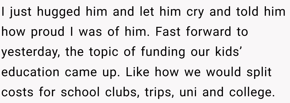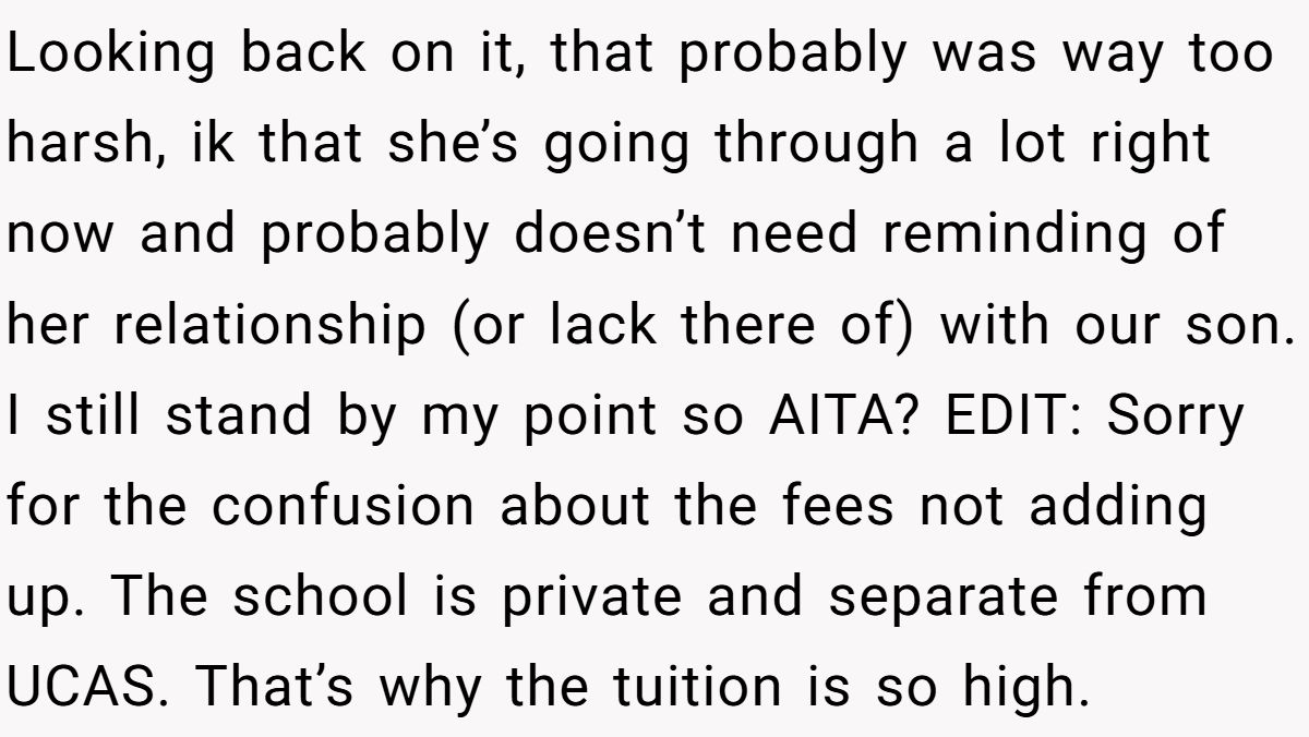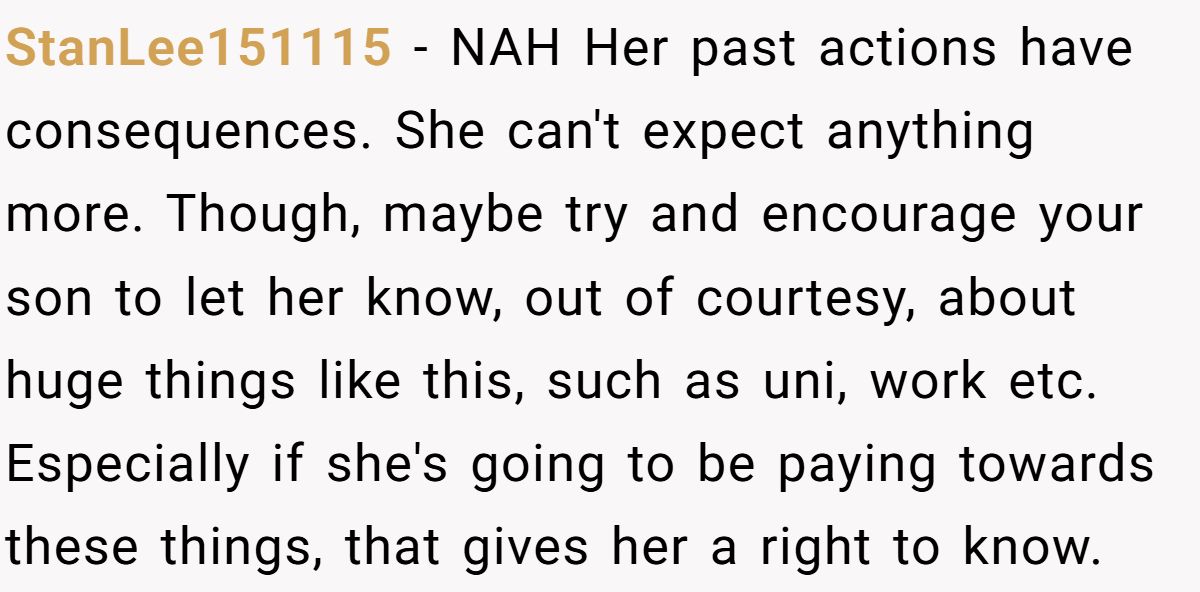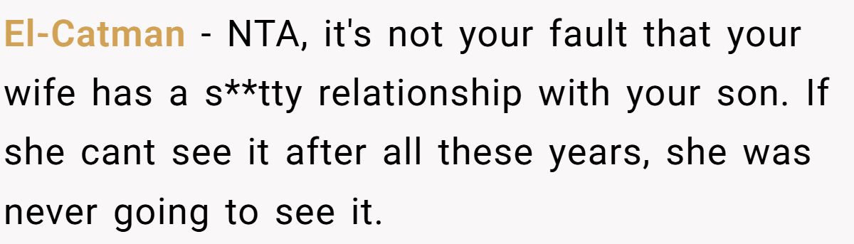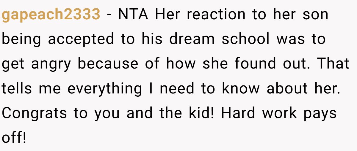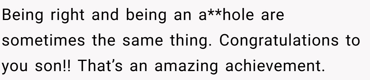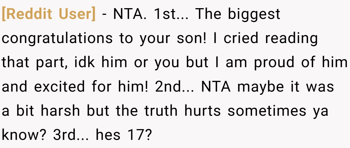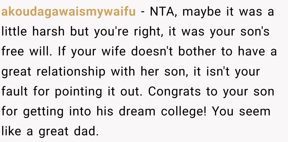 These commenters backed you up, saying you were honest about your wife’s strained relationship with your son and praising your support for his big achievement.