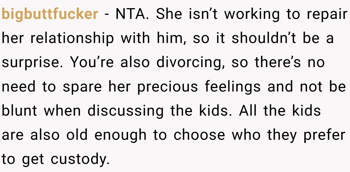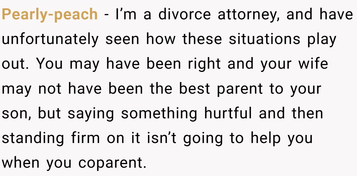 Dr. John Gottman, a respected family therapist, says, “In high-conflict divorces, parents must prioritize validating their children’s feelings to maintain trust, even when tensions run high.” His wife’s reaction—anger and shouting—shows she is struggling to process her son’s rejection. While Honest Dad’s accusation had truth behind it, delivering it in the heat of the moment probably shut down any chance she would reflect. Instead, she felt attacked and blamed.