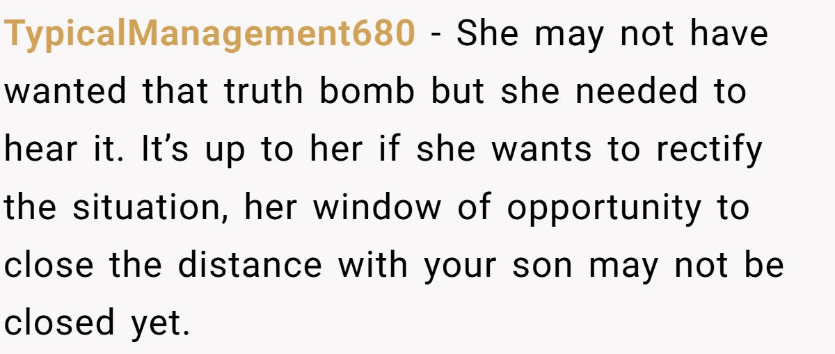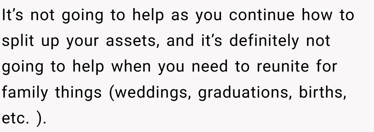 These comments pointed out OP was honest but also warned that blunt words could make coparenting and future family events harder.